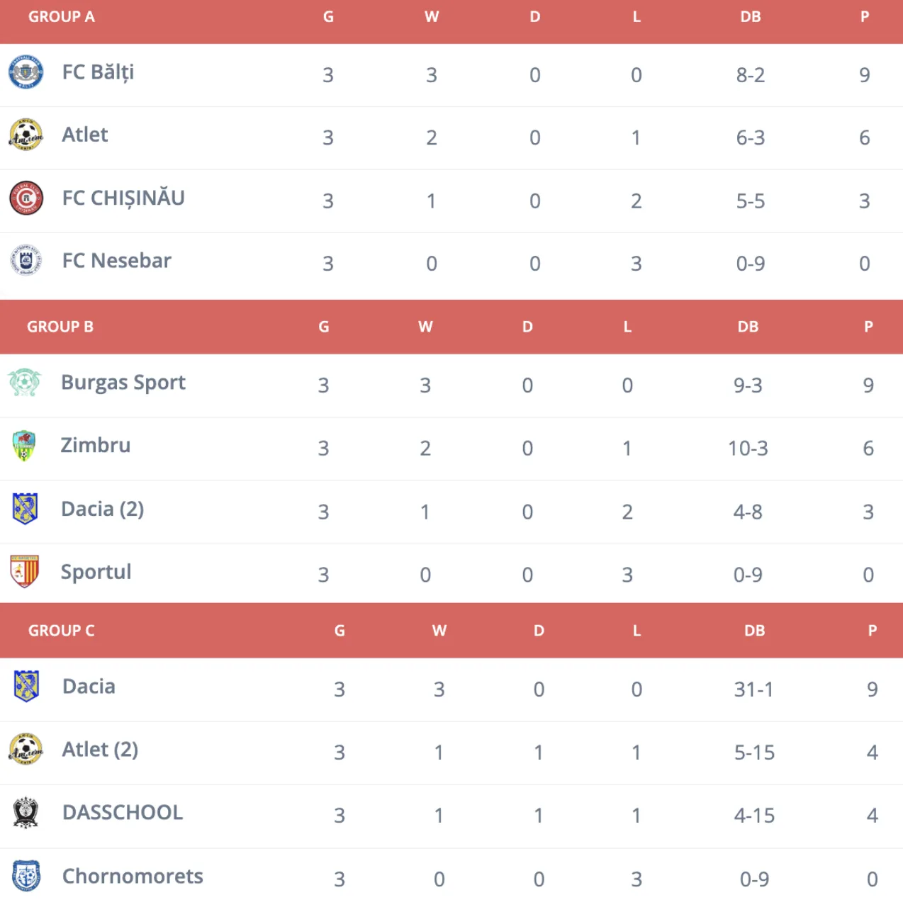 Alte două echipe moldovenești au acumulat câte trei puncte: FC Chișinău în grupa A a învins FC Nesebar (0-3), iar Dacia Buiucani în grupa B a învins FC Sportul (0-3). FC Sportul a pierdut toate meciurile din grupă.