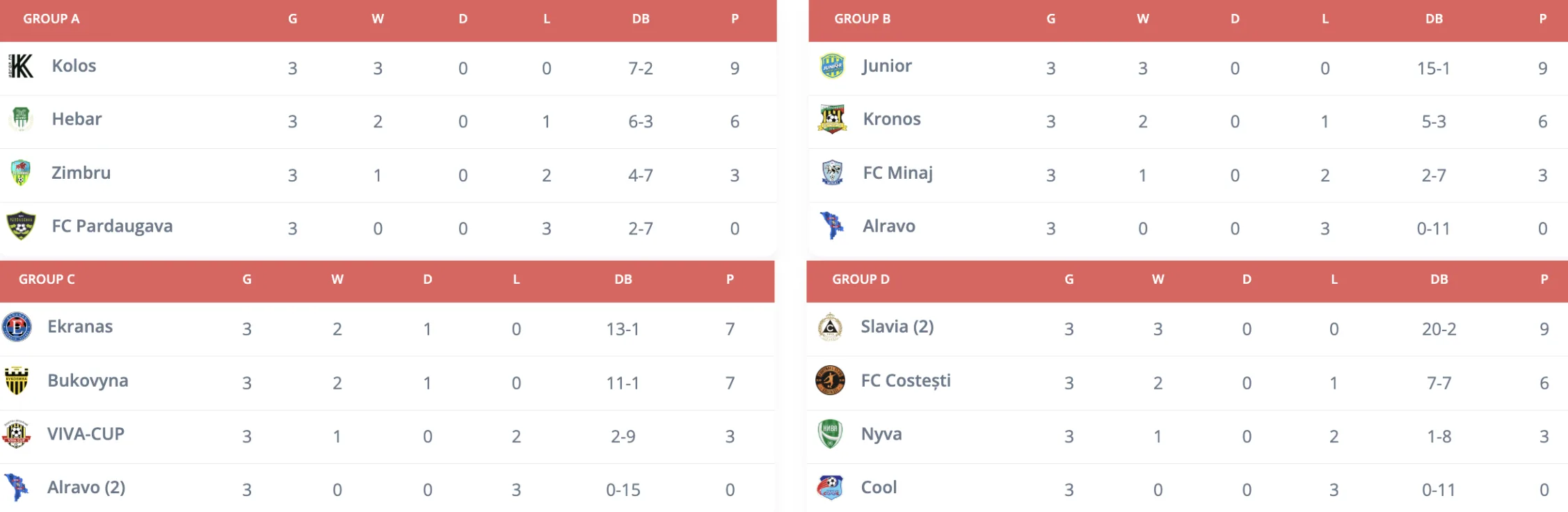 FC Zimbru a obținut șase puncte în grupa B, învingând echipele moldovenești Dacia Buiucani (0-5) și FC Sportul (0-3). DASSCHOOL a acumulat patru puncte în grupa C, învingând clubul bulgar Chornomorets (3-0) și remizând cu clubul ucrainean Atlet (1-1).