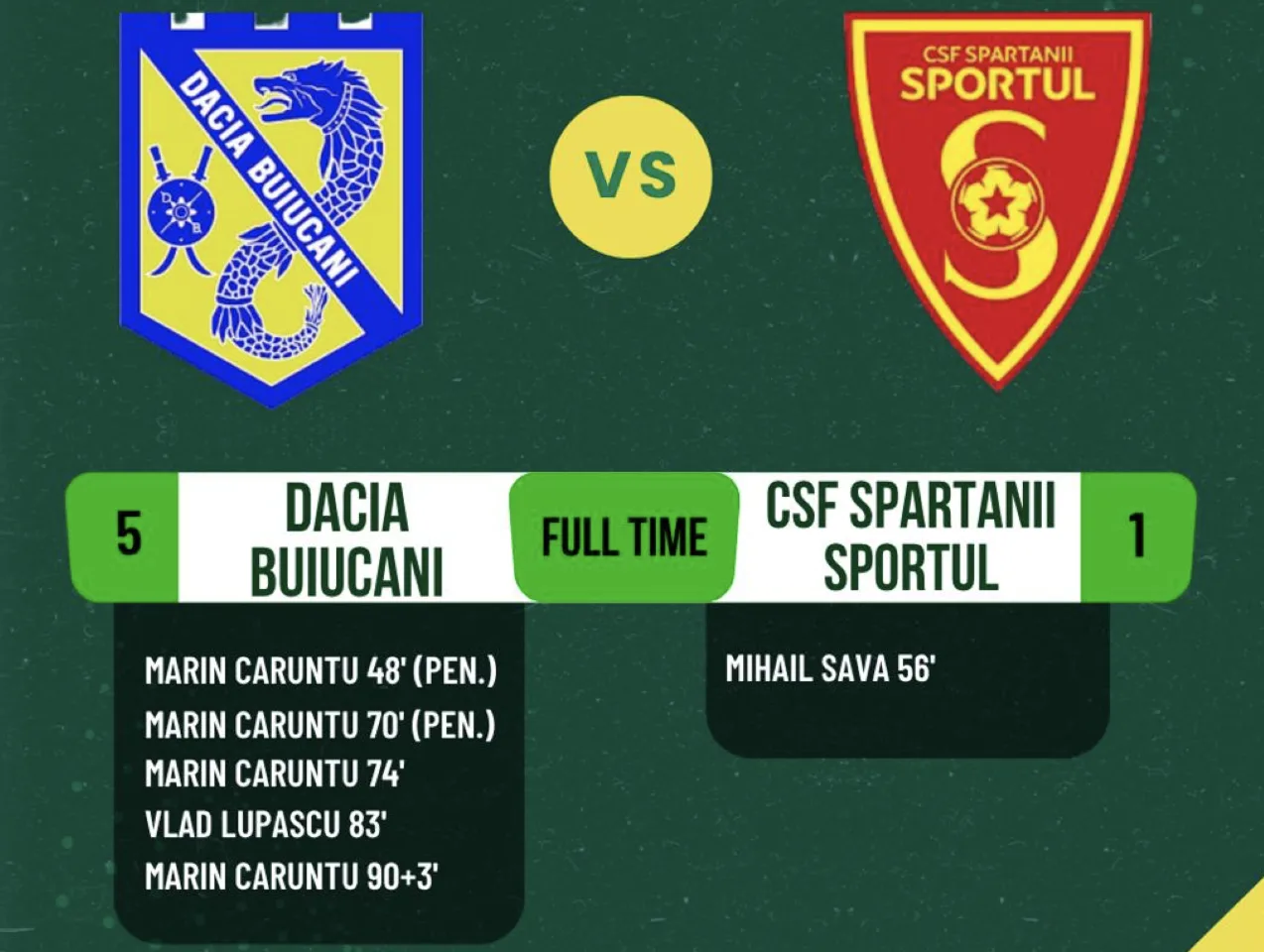 Pentru Dacia Buiucani, un poker a fost realizat de atacantul moldovean în vârstă de 27 de ani, Marin Căruntu, care a marcat din penalty în minutele 48 și 70, iar din acțiune în minutele 74 și 90+3. Un alt gol pentru Dacia Buiucani a fost înscris de Vlad Lupașco în minutul 83 al partidei.