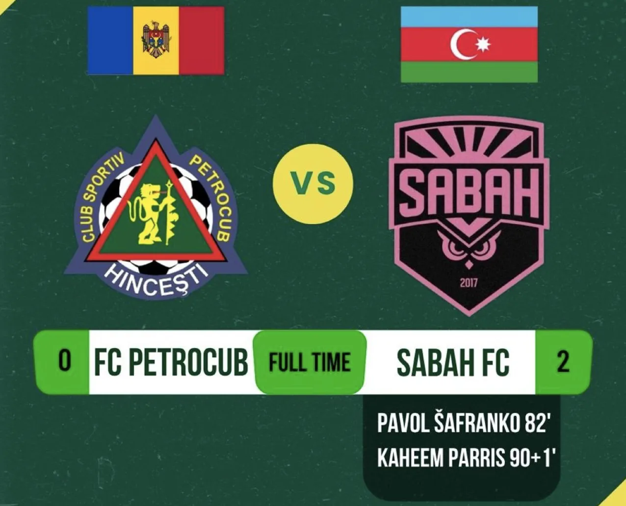 Scorul în meci a fost deschis în minutul 82 de atacantul slovac în vârstă de 30 de ani al echipei Sabah FC, Pavol Šafranko. Avantajul oaspeților a fost dublat în minutul 90+1 de mijlocașul jamaican în vârstă de 25 de ani, Pavol Šafranko.