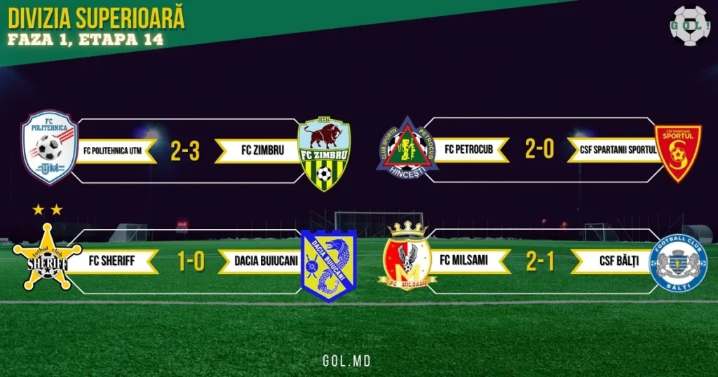 În Moldova, în weekendul trecut, pe 27 și 28 septembrie, s-au disputat patru meciuri din etapa a 14-a a diviziei superioare. FC Zimbru a fost aproape să piardă puncte în confruntarea cu FC Politehnica UTM, dar a smuls victoria în ultimele minute, iar FC Sheriff și-a menținut șefia în clasament. GOL! prezintă rezultatele tuturor meciurilor disputate.