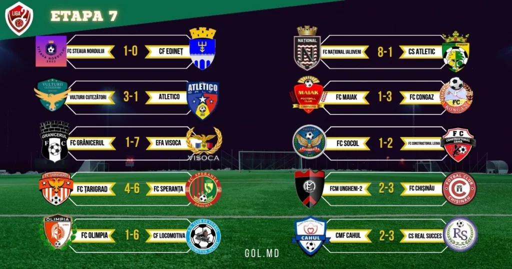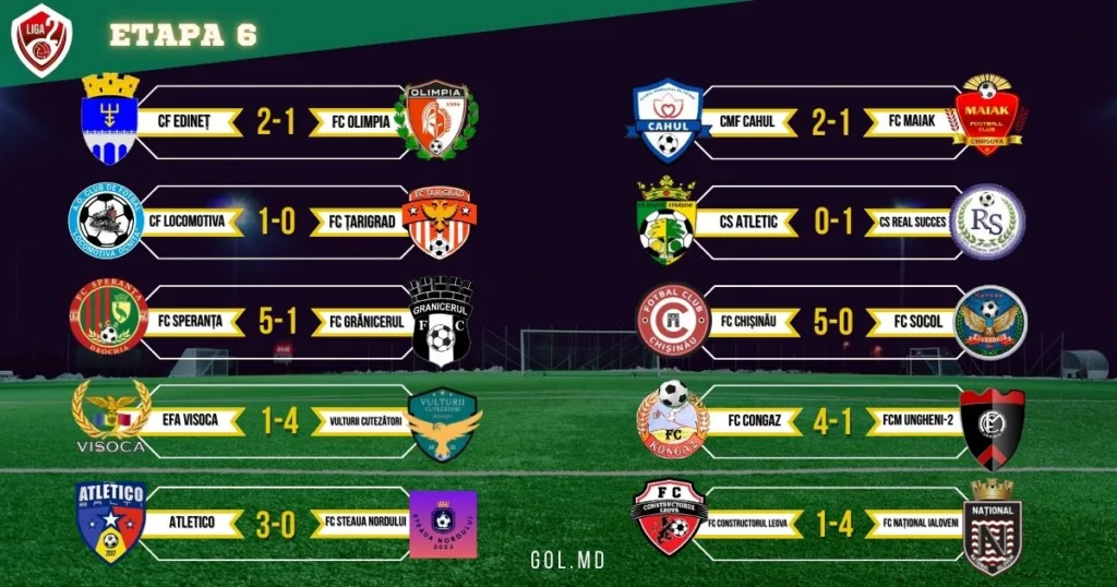 В Молдове 20 сентября прошли десять матчей шестого тура Лиги 2. Шесть из них завершились с разгромным счетом, а «Вултурий Кутезэторь» и ФК «Конгаз» одержали очередные победы, укрепив