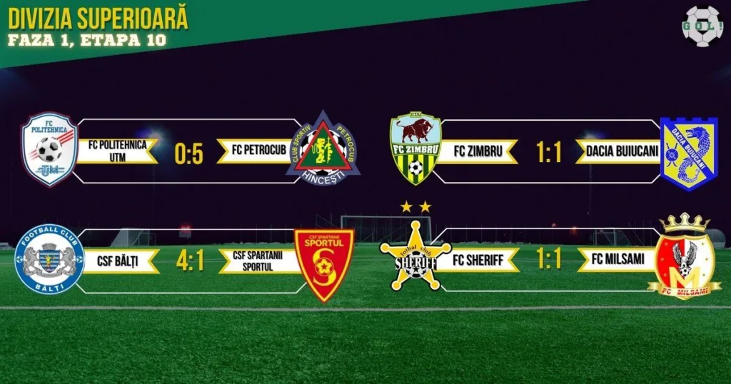 В Молдове в минувшие выходные, 23 и 24 августа, прошел десятый тур высшего дивизиона. ФК «Петрокуб» и СФК «Бэлць» разгромили соперников в своих матчах, а две другие игры завершились ничьей. GOL! представляет результаты матчей минувшего тура.