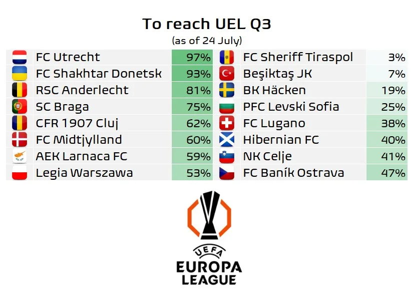 Football Meets Data оценила вероятность реванша ФК «Шериф» против нидерландского ФК «Утрехт» и выхода тираспольского клуба в третий квалификационный раунд Лиги Европы всего в 3%. Шансы ФК «Петрокуб» пройти азербайджанский клуб «Сабах» в Лиге конференций оценили в 5%.