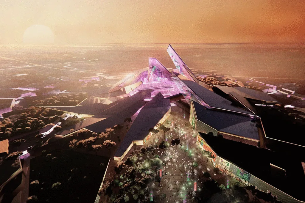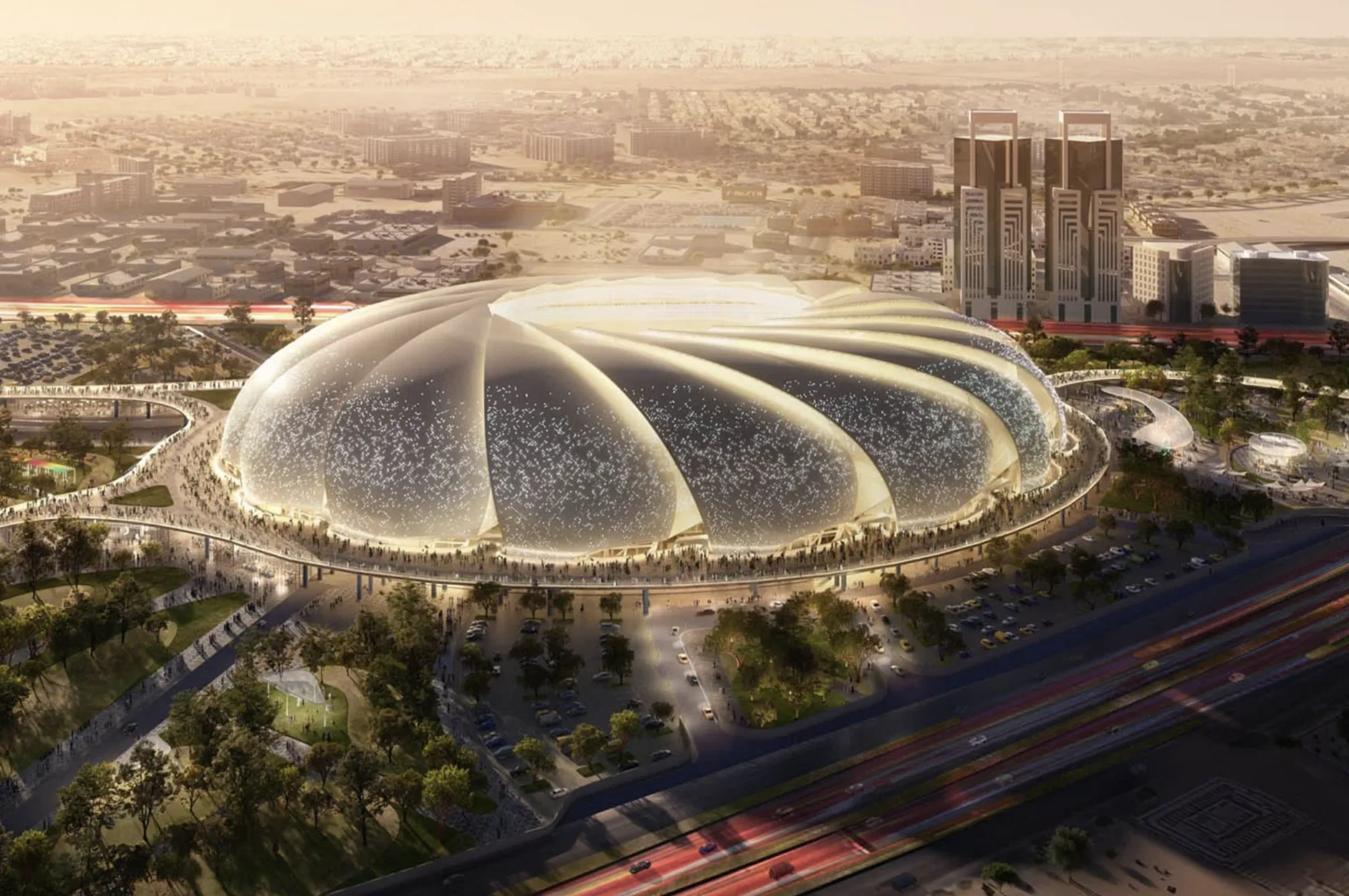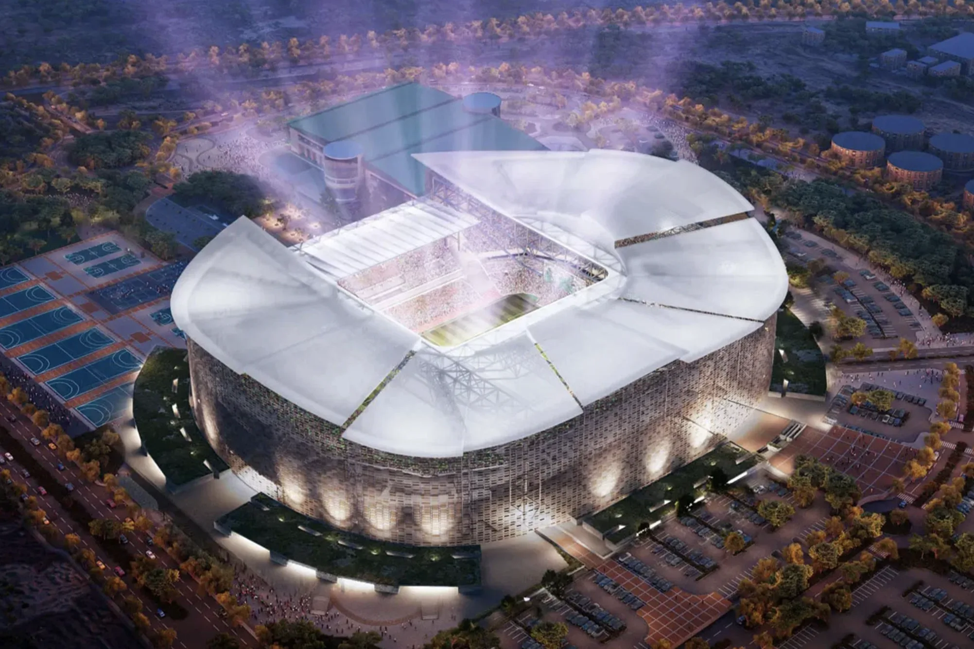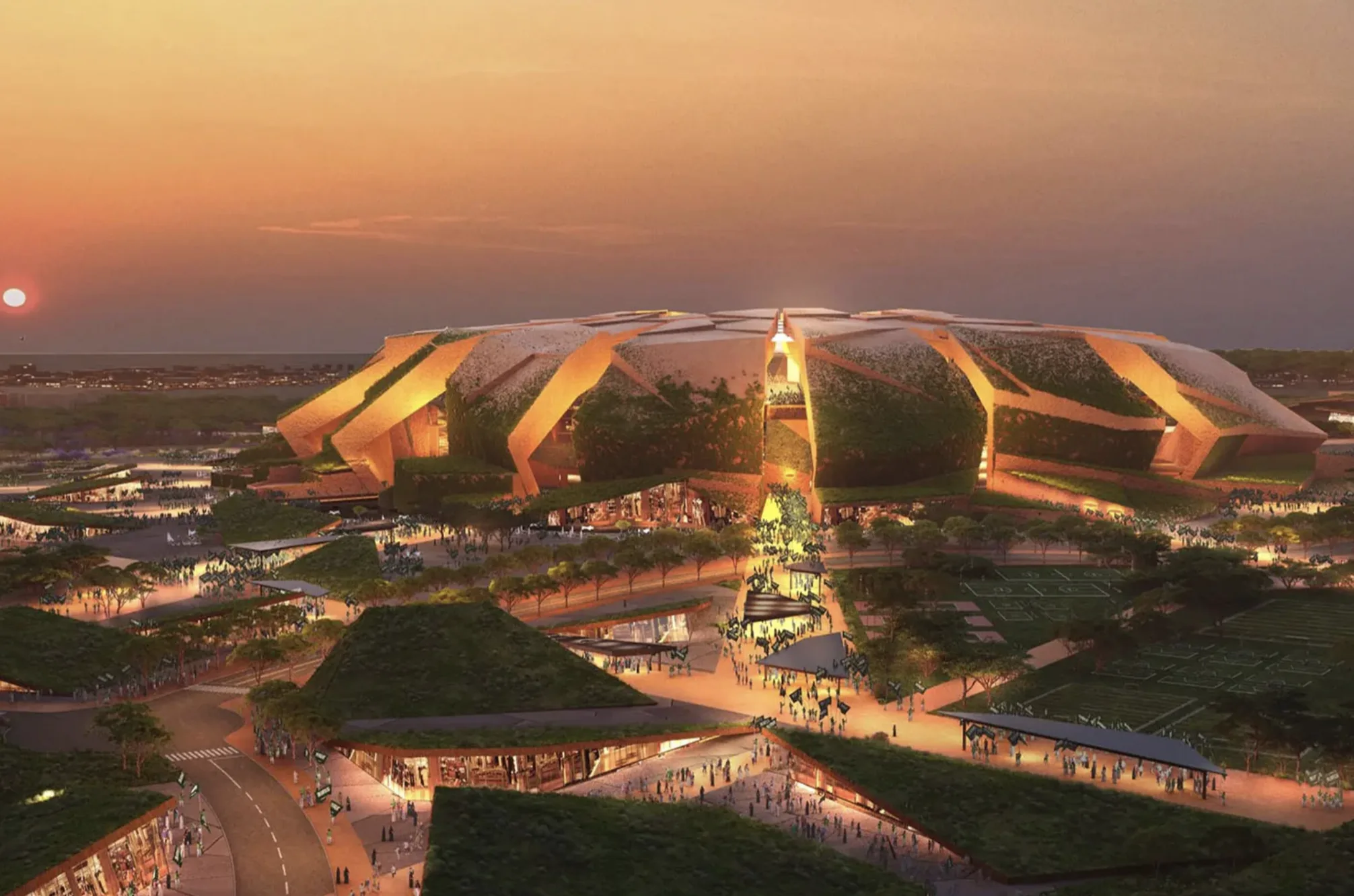 Стадион, спроектированный ROSHN Group, займет 450 000 м² и окружен «зеленой зоной» для прогулок и развлечений. После ЧМ-2034 здесь появятся магазины, рестораны, отели и образовательные учреждения. Чаша арены в форме седла с трибунами разной высоты обеспечивает тень, вентиляцию и улучшенную акустику, а дизайн напоминает светящиеся ночью хрустальные осколки.