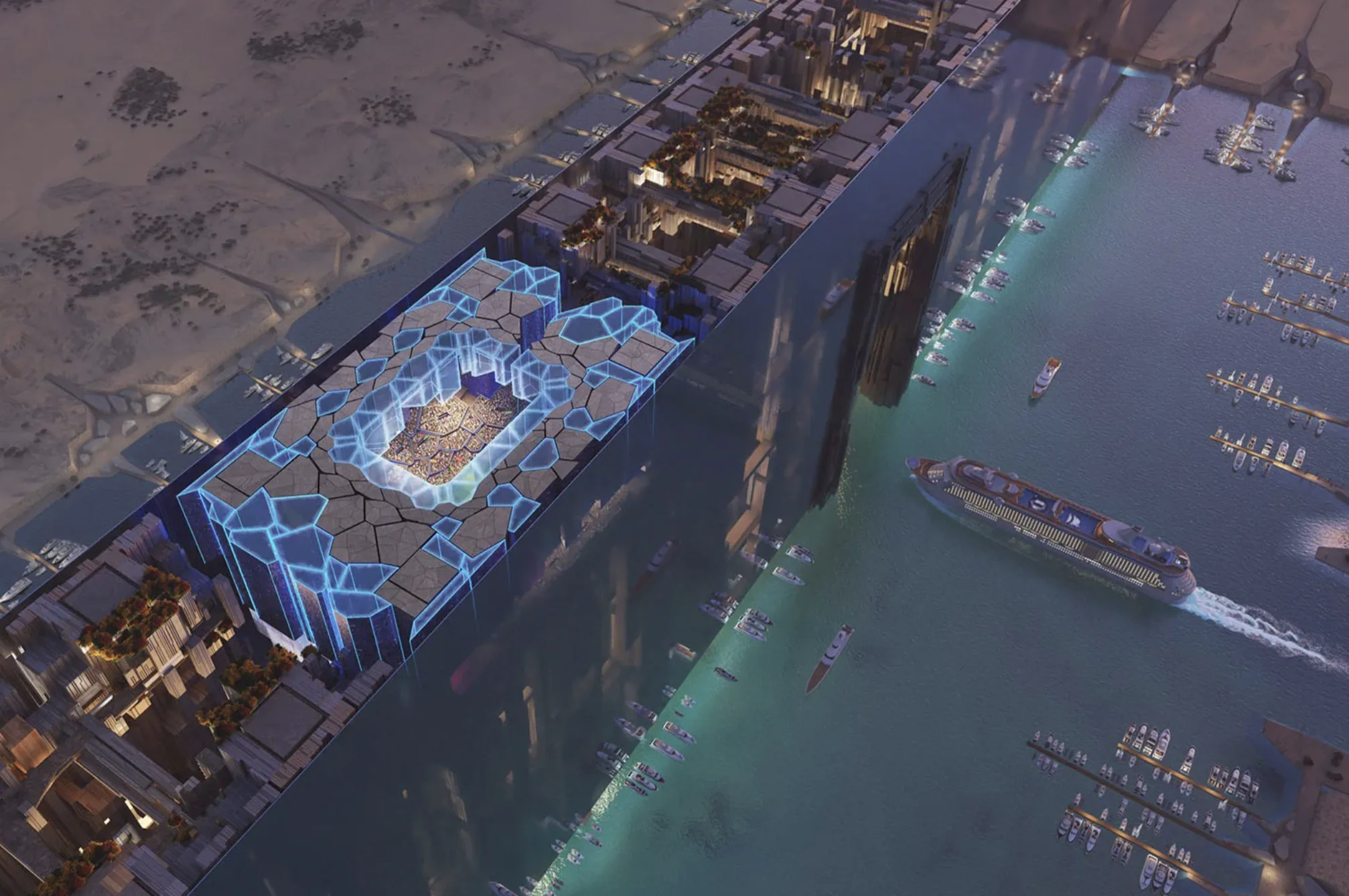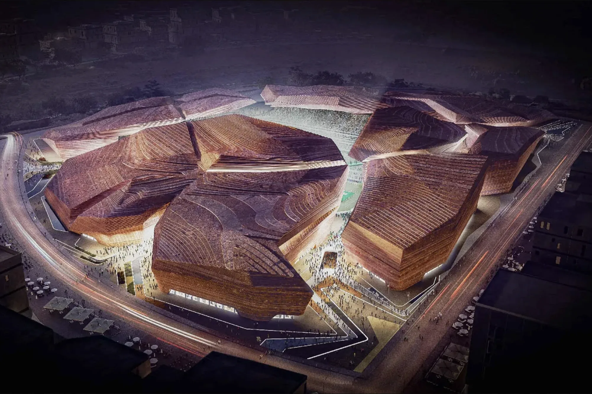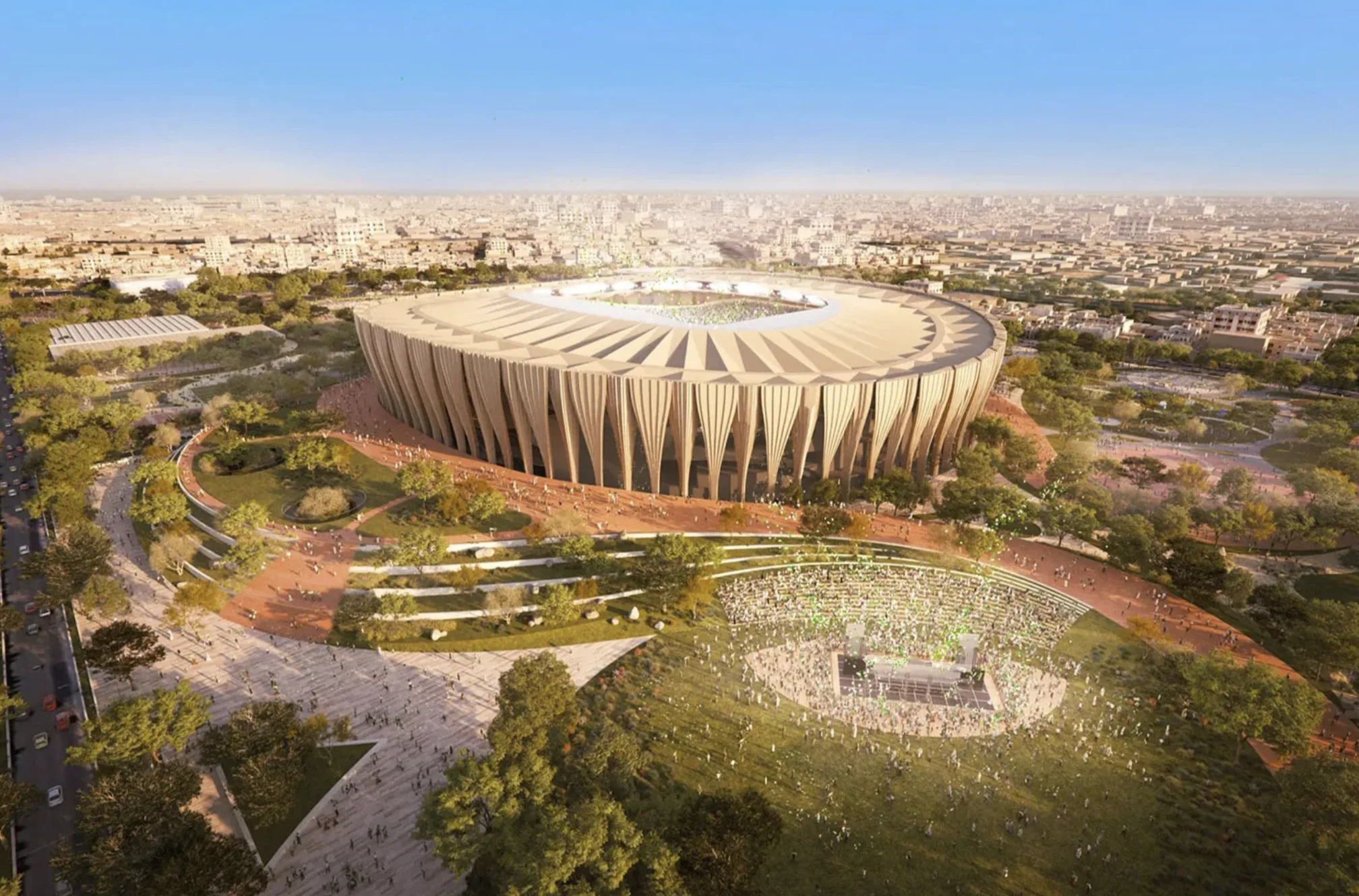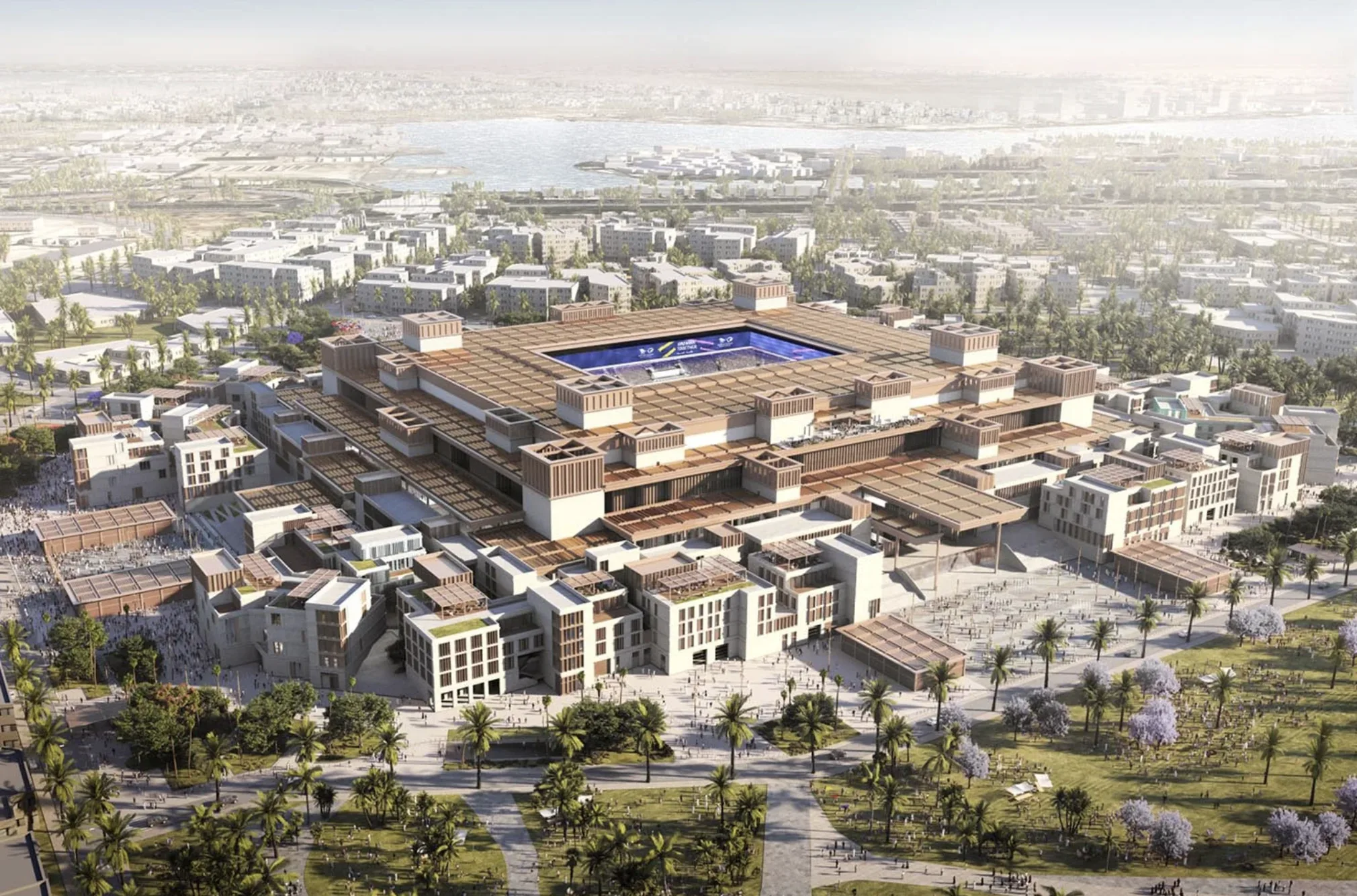 Стадион, спроектированный ROSHN Group, займет 450 000 м² и окружен «зеленой зоной» для прогулок и развлечений. После ЧМ-2034 здесь появятся магазины, рестораны, отели и образовательные учреждения. Чаша арены в форме седла с трибунами разной высоты обеспечивает тень, вентиляцию и улучшенную акустику, а дизайн напоминает светящиеся ночью хрустальные осколки.