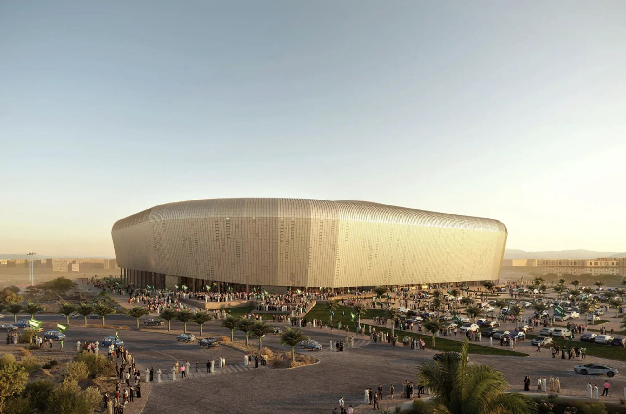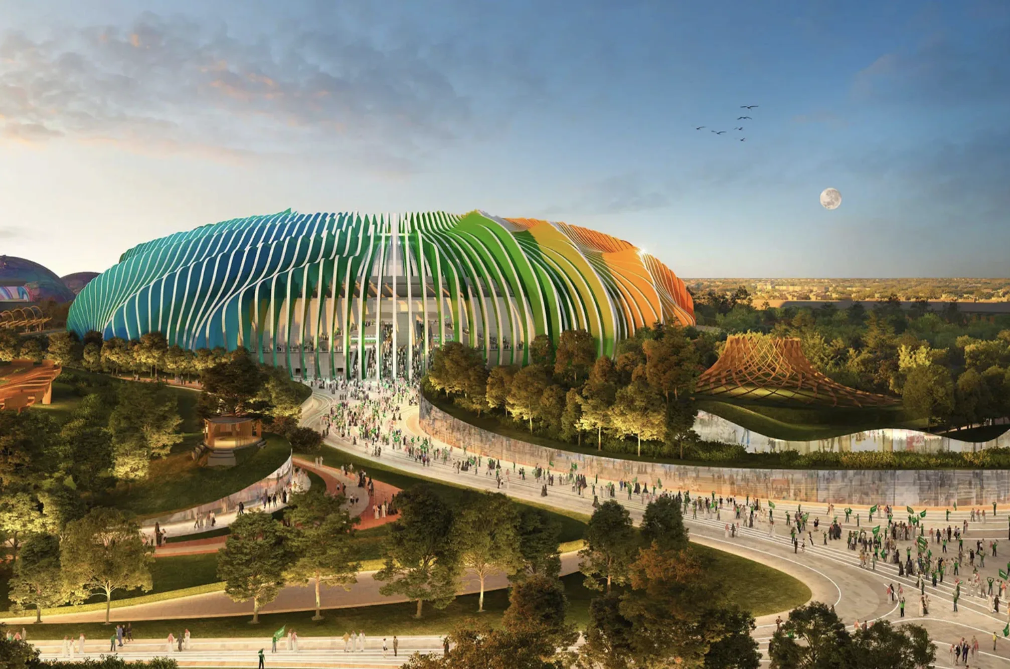 Стадион «Киддия-Кост» в Джидде, расположенный на побережье Красного моря, спроектирован Populous и напоминает трассу Формулы-1. Волнообразные формы и яркая палитра символизируют динамику между людьми и водой. Уникальность стадиона в том, что его не будут использовать для футбольных матчей чемпионата мира-2034 — он будет просто многофункциональным развлекательным комплексом. После турнира, благодаря съемному футбольному полю, на площадке планируют проводить киберспортивные мероприятия, выставки и концерты.